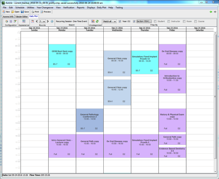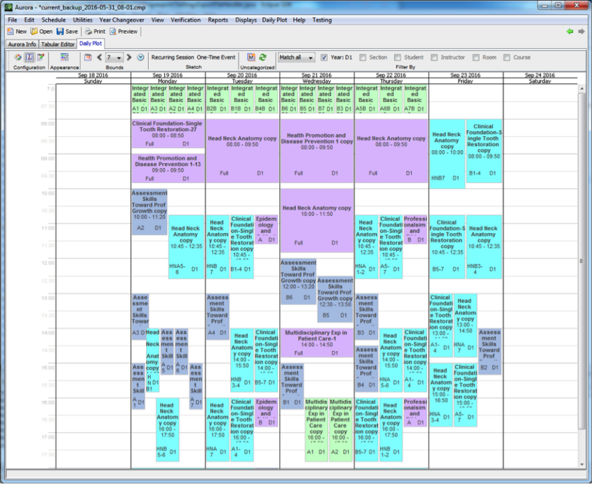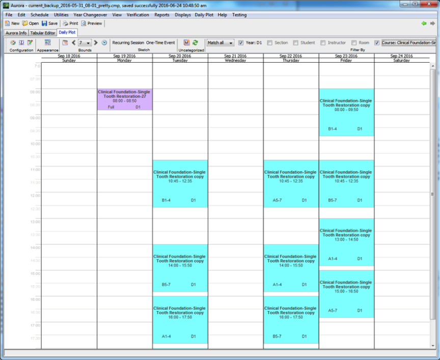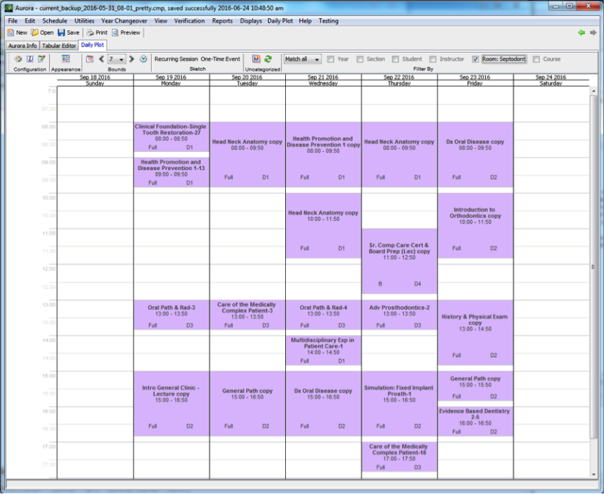 The Daily Plot allows the user to view the events that are occurring in a calendar-style view. The user can easily filter the plot by year, course, student, or room, or can define a more complicated filter criteria. This example shows the D1 schedule for one week.